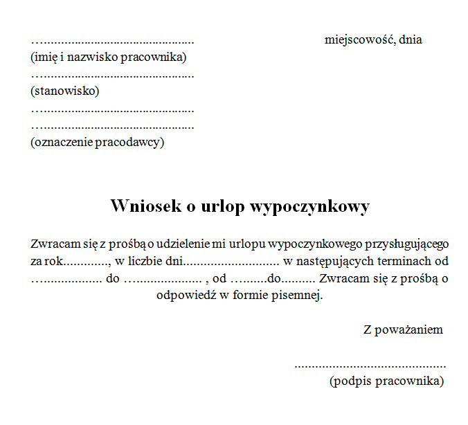 Proszę sporządzić wniosek w dwóch egzemplarzach, na kopii zwrócić się z prośbą o potwierdzenie odbioru wniosku przez przedstawiciela Pracodawcy!