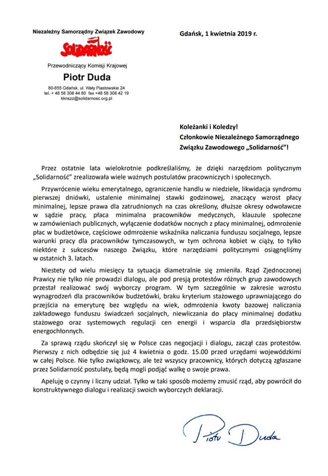 Apel Piotra Dudy do członków i sympatyków NSZZ "Solidarność".
