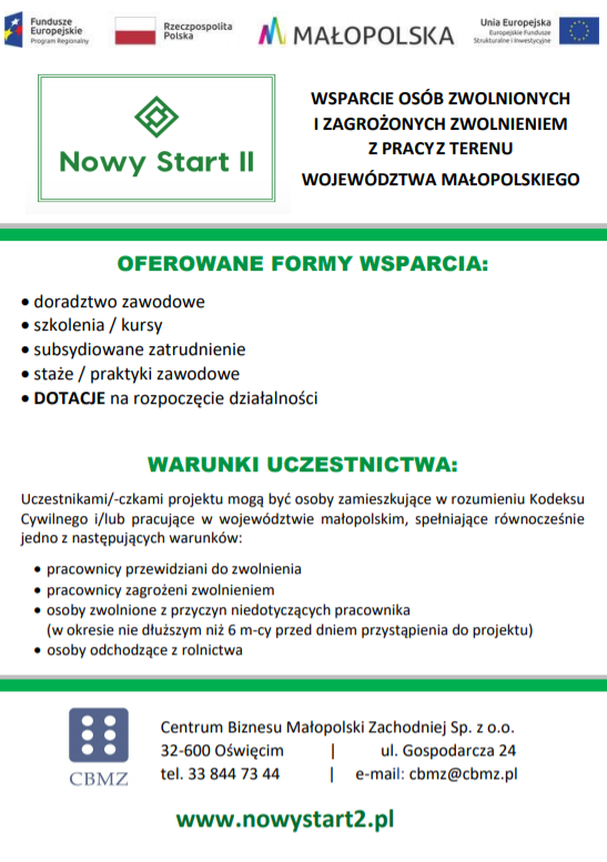 Centrum Biznesu Małopolski Zachodniej Sp. z o.o. realizuje projekt NOWY START II, który skierowany jest do osób zwolnionych i zagrożonych zwolnieniem z pracy z terenu Województwa Małopolskiego.